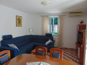 Ferienwohnung bietet Platz für 8 Gäste. Die Betten sind in Schlafzimmern, die es 3 gibt, und in Wohnzimmer, innerhalb einer Gesamtfläche von 77m2, angeordnet. Die Gäste haben eine eigene Terrasse zur Verfügung, auf der sie in warmen Sommernächten genießen können. Es ist erlaubt, Speisen auf dem Gemeinschafts-Grill vorzubereiten. In der Unterkunftseinheit besteht die Möglichkeit des Mitbringens von Haustieren gegen Aufpreis.