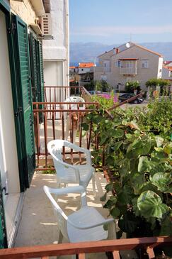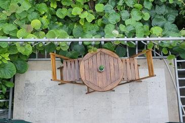 Ferienwohnung bietet Platz für 6 Gäste. Die Betten sind in Schlafzimmern, die es 2 gibt, und in Wohnzimmer, innerhalb einer Gesamtfläche von 57m2, angeordnet. Die Gäste haben eine eigene Terrasse zur Verfügung, auf der sie in warmen Sommernächten genießen können. Das Apartment bietet Meerblick. Es ist erlaubt, Speisen auf dem Gemeinschafts-Grill vorzubereiten.