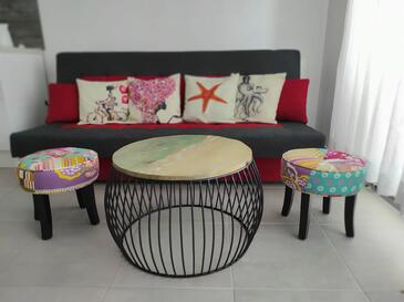 Ferienwohnung bietet Platz für 5 Gäste. Die Betten sind in Schlafzimmern, die es 2 gibt, innerhalb einer Gesamtfläche von 45m2, angeordnet. Die Gäste haben eine eigene Terrasse zur Verfügung, auf der sie in warmen Sommernächten genießen können. Das Apartment bietet Meerblick. Es ist erlaubt, Speisen auf dem Gemeinschafts-Grill vorzubereiten. Während ihres Aufenthalts können Gäste das gemeinsam zur Nutzung stehende Schwimmbad benutzen. In der Unterkunftseinheit besteht die Möglichkeit des Mitbringens von Haustieren gegen Aufpreis.