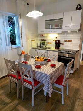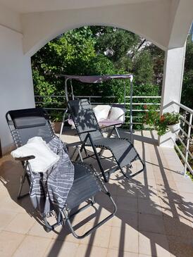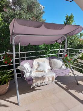 Ferienwohnung bietet Platz für 5 Gäste. Die Betten sind in Schlafzimmern, die es 3 gibt, innerhalb einer Gesamtfläche von 60m2, angeordnet. Die Gäste haben eine eigene Terrasse zur Verfügung, auf der sie in warmen Sommernächten genießen können. Das Apartment bietet Meerblick. Es ist erlaubt, Speisen auf dem Gemeinschafts-Grill vorzubereiten.