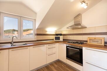 Haus bietet Platz für 6 Gäste. Die Betten sind in Schlafzimmern, die es 4 gibt, und in Wohnzimmer, innerhalb einer Gesamtfläche von 74m2, angeordnet. Die Gäste haben einen eigenen Balkon zur Verfügung, auf der sie in warmen Sommernächten genießen können. Das Haus bietet Meerblick. Es ist erlaubt, Speisen auf dem Gemeinschafts-Grill vorzubereiten.