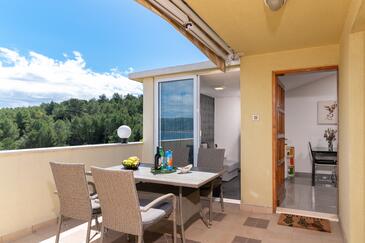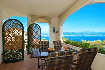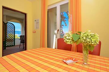 Ferienwohnung bietet Platz für 5 Gäste. Die Betten sind in Schlafzimmern, die es 2 gibt, und in Wohnzimmer, innerhalb einer Gesamtfläche von 43m2, angeordnet. Die Gäste haben eine eigene Terrasse zur Verfügung, auf der sie in warmen Sommernächten genießen können. Das Apartment bietet Meerblick. Es ist erlaubt, Speisen auf dem Gemeinschafts-Grill vorzubereiten.
