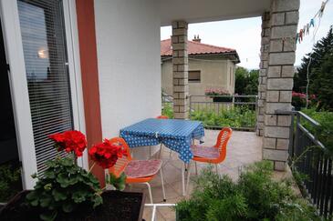 Ferienwohnung bietet Platz für 5 Gäste. Die Betten sind in Schlafzimmern, die es 2 gibt, innerhalb einer Gesamtfläche von 42m2, angeordnet. Die Gäste haben eine eigene Terrasse zur Verfügung, auf der sie in warmen Sommernächten genießen können. Das Apartment bietet Meerblick. Es ist erlaubt, Speisen auf dem Gemeinschafts-Grill vorzubereiten.