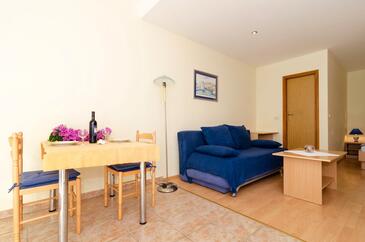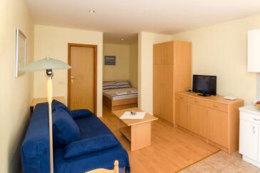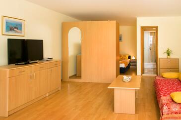 Studio bietet Platz für 4 Gäste. Die Betten sind in Schlafzimmern, die es 1 gibt, und in Wohnzimmer, innerhalb einer Gesamtfläche von 38m2, angeordnet. Die Gäste haben eine eigene Terrasse zur Verfügung, auf der sie in warmen Sommernächten genießen können.