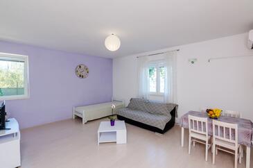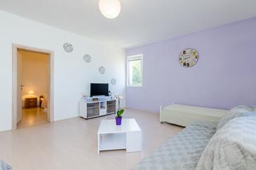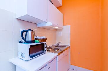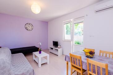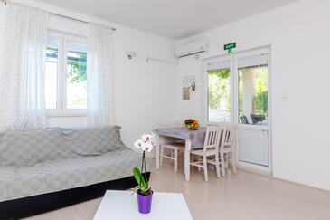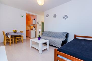 Ferienwohnung bietet Platz für 4 Gäste. Die Betten sind in Schlafzimmern, die es 1 gibt, und in Wohnzimmer, innerhalb einer Gesamtfläche von 47m2, angeordnet. Die Gäste haben eine eigene Terrasse zur Verfügung, auf der sie in warmen Sommernächten genießen können. Das Apartment bietet Meerblick. Es ist erlaubt, Speisen auf dem Gemeinschafts-Grill vorzubereiten.