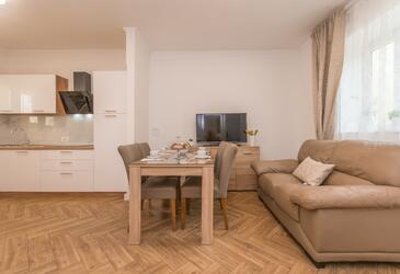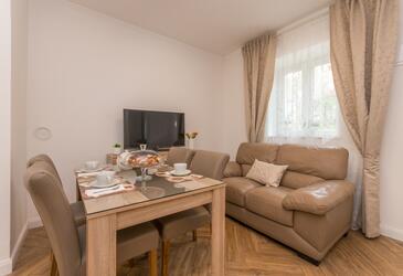 Ferienwohnung bietet Platz für 4 Gäste. Die Betten sind in Schlafzimmern, die es 2 gibt, innerhalb einer Gesamtfläche von 42m2, angeordnet. Die Gäste haben eine eigene Terrasse zur Verfügung, auf der sie in warmen Sommernächten genießen können. Es ist erlaubt, Speisen auf dem Gemeinschafts-Grill vorzubereiten.