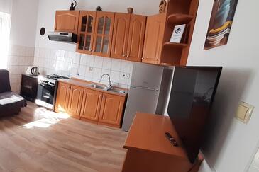 Ferienwohnung bietet Platz für 5 Gäste. Die Betten sind in Schlafzimmern, die es 2 gibt, innerhalb einer Gesamtfläche von 59m2, angeordnet. Die Gäste haben eine eigene Terrasse zur Verfügung, auf der sie in warmen Sommernächten genießen können. Es ist erlaubt, Speisen auf dem Gemeinschafts-Grill vorzubereiten.
