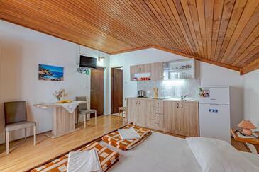 Ferienwohnung bietet Platz für 3 Gäste. Die Betten sind in Schlafzimmern, die es 1 gibt, innerhalb einer Gesamtfläche von 23m2, angeordnet. Die Gäste haben eine eigene Terrasse zur Verfügung, auf der sie in warmen Sommernächten genießen können. Es ist erlaubt, Speisen auf dem Gemeinschafts-Grill vorzubereiten.