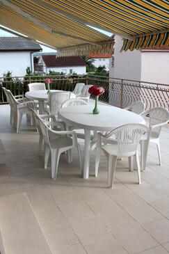 Ferienwohnung bietet Platz für 12 Gäste. Die Betten sind in Schlafzimmern, die es 5 gibt, innerhalb einer Gesamtfläche von 124m2, angeordnet. Die Gäste haben eine eigene Terrasse zur Verfügung, auf der sie in warmen Sommernächten genießen können. Es ist erlaubt, Speisen auf dem Gemeinschafts-Grill vorzubereiten.