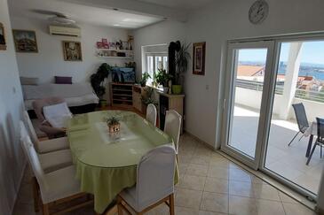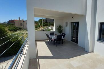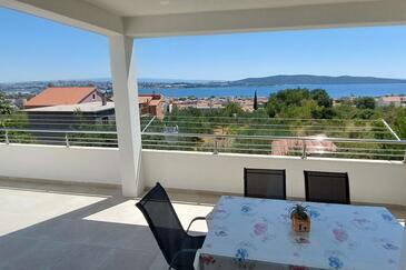 Ferienwohnung bietet Platz für 6 Gäste. Die Betten sind in Schlafzimmern, die es 2 gibt, und in Wohnzimmer, innerhalb einer Gesamtfläche von 75m2, angeordnet. Die Gäste haben eine eigene Terrasse zur Verfügung, auf der sie in warmen Sommernächten genießen können. Das Apartment bietet Meerblick. Es ist erlaubt, Speisen auf dem Gemeinschafts-Grill vorzubereiten.