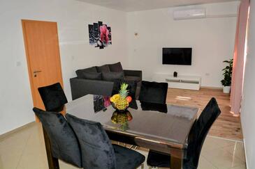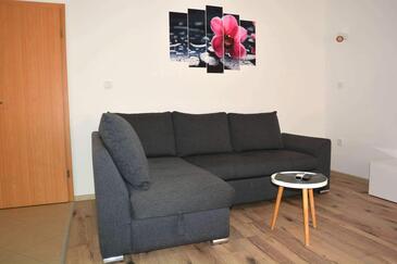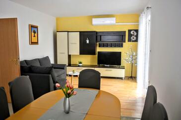 Ferienwohnung bietet Platz für 6 Gäste. Die Betten sind in Schlafzimmern, die es 2 gibt, und in Wohnzimmer, innerhalb einer Gesamtfläche von 74m2, angeordnet. Die Gäste haben eine eigene Terrasse zur Verfügung, auf der sie in warmen Sommernächten genießen können. Es ist erlaubt, Speisen auf dem Gemeinschafts-Grill vorzubereiten.