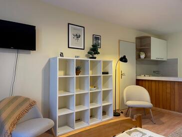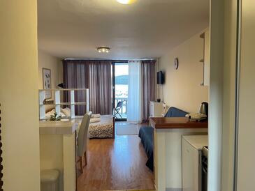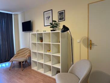 Studio bietet Platz für 2 Gäste. Die Betten sind in Schlafzimmern, die es 1 gibt, innerhalb einer Gesamtfläche von 29m2, angeordnet. Die Gäste haben eine eigene Terrasse zur Verfügung, auf der sie in warmen Sommernächten genießen können. Das Studio-Apartment bietet Meerblick. Es ist erlaubt, Speisen auf dem Gemeinschafts-Grill vorzubereiten.