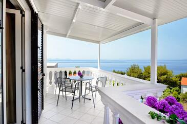 Ferienwohnung bietet Platz für 5 Gäste. Die Betten sind in Schlafzimmern, die es 2 gibt, innerhalb einer Gesamtfläche von 51m2, angeordnet. Die Gäste haben eine eigene Terrasse zur Verfügung, auf der sie in warmen Sommernächten genießen können. Das Apartment bietet Meerblick. Es ist erlaubt, Speisen auf dem Gemeinschafts-Grill vorzubereiten.