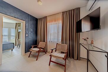Ferienwohnung bietet Platz für 5 Gäste. Die Betten sind in Schlafzimmern, die es 2 gibt, und in Wohnzimmer, innerhalb einer Gesamtfläche von 54m2, angeordnet. Die Gäste haben eine eigene Terrasse zur Verfügung, auf der sie in warmen Sommernächten genießen können. Das Apartment bietet Meerblick. Es ist erlaubt, Speisen auf dem Gemeinschafts-Grill vorzubereiten. In der Unterkunftseinheit besteht die Möglichkeit des Mitbringens von Haustieren gegen Aufpreis.
