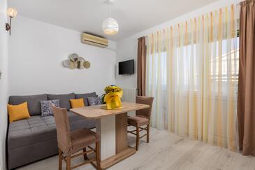 Ferienwohnung bietet Platz für 4 Gäste. Die Betten sind in Schlafzimmern, die es 2 gibt, innerhalb einer Gesamtfläche von 70m2, angeordnet. Die Gäste haben eine eigene Terrasse zur Verfügung, auf der sie in warmen Sommernächten genießen können. Es ist erlaubt, Speisen auf dem Gemeinschafts-Grill vorzubereiten.