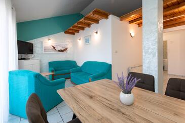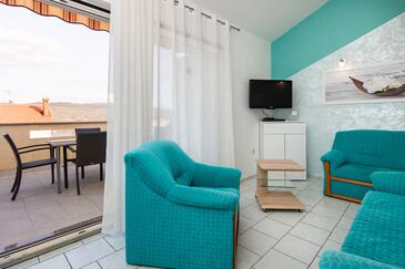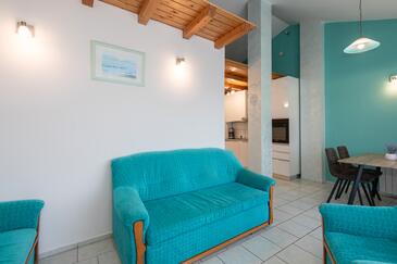 Ferienwohnung bietet Platz für 4 Gäste. Die Betten sind in Schlafzimmern, die es 2 gibt, innerhalb einer Gesamtfläche von 42m2, angeordnet. Die Gäste haben eine eigene Terrasse zur Verfügung, auf der sie in warmen Sommernächten genießen können. Das Apartment bietet Meerblick.