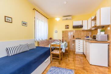 Studio bietet Platz für 4 Gäste. Die Betten sind in Schlafzimmern, die es 1 gibt, und in Wohnzimmer, innerhalb einer Gesamtfläche von 28m2, angeordnet. Die Gäste haben eine eigene Terrasse zur Verfügung, auf der sie in warmen Sommernächten genießen können. Das Studio-Apartment bietet Meerblick. Es ist erlaubt, Speisen auf dem Gemeinschafts-Grill vorzubereiten. In der Unterkunftseinheit besteht die Möglichkeit des Mitbringens von Haustieren gegen Aufpreis.