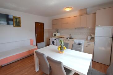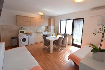 Ferienwohnung bietet Platz für 8 Gäste. Die Betten sind in Schlafzimmern, die es 3 gibt, innerhalb einer Gesamtfläche von 77m2, angeordnet. Die Gäste haben eine eigene Terrasse zur Verfügung, auf der sie in warmen Sommernächten genießen können. In der Unterkunftseinheit besteht die Möglichkeit des Mitbringens von Haustieren gegen Aufpreis.
