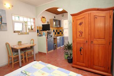 Ferienwohnung bietet Platz für 4 Gäste. Die Betten sind in Schlafzimmern, die es 2 gibt, innerhalb einer Gesamtfläche von 59m2, angeordnet. Die Gäste haben eine eigene Terrasse zur Verfügung, auf der sie in warmen Sommernächten genießen können. Das Apartment bietet Meerblick. Es ist erlaubt, Speisen auf dem Gemeinschafts-Grill vorzubereiten. In der Unterkunftseinheit besteht die Möglichkeit des Mitbringens von Haustieren gegen Aufpreis. Durch die Terrasse der gebuchten Unterkunftseinheit gehen auch andere Gäste oder Vermieter.