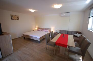 Studio bietet Platz für 3 Gäste. Die Betten sind in Wohnzimmer, innerhalb einer Gesamtfläche von 28m2, angeordnet. Die Gäste haben einen eigenen Balkon zur Verfügung, auf der sie in warmen Sommernächten genießen können.