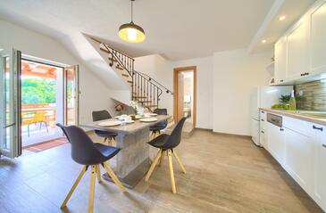 Haus bietet Platz für 5 Gäste. Die Betten sind in Schlafzimmern, die es 2 gibt, und in Wohnzimmer, innerhalb einer Gesamtfläche von 81m2, angeordnet. Die Gäste haben eine eigene Terrasse zur Verfügung, auf der sie in warmen Sommernächten genießen können.