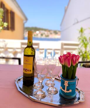 Ferienwohnung bietet Platz für 5 Gäste. Die Betten sind in Schlafzimmern, die es 3 gibt, innerhalb einer Gesamtfläche von 53m2, angeordnet. Die Gäste haben eine eigene Terrasse zur Verfügung, auf der sie in warmen Sommernächten genießen können. Das Apartment bietet Meerblick.