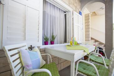 Ferienwohnung bietet Platz für 6 Gäste. Die Betten sind in Schlafzimmern, die es 2 gibt, und in Wohnzimmer, innerhalb einer Gesamtfläche von 50m2, angeordnet. Die Gäste haben eine eigene Terrasse zur Verfügung, auf der sie in warmen Sommernächten genießen können.