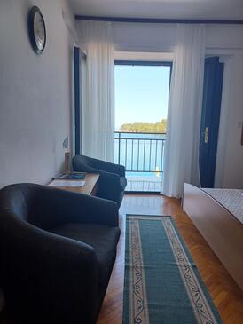 Zimmer bietet Platz für 2 Gäste. Die Betten sind in Schlafzimmern, die es 1 gibt, innerhalb einer Gesamtfläche von 15m2, angeordnet. Die Gäste haben eine eigene Terrasse zur Verfügung, auf der sie in warmen Sommernächten genießen können. Das Zimmer bietet Meerblick. Die reservierte Unterkunftseinheit ist ein Zimmer die ein gemeinsames Badezimmer nutzt und keine Möglichkeit der Nutzung einer Küche hat.
