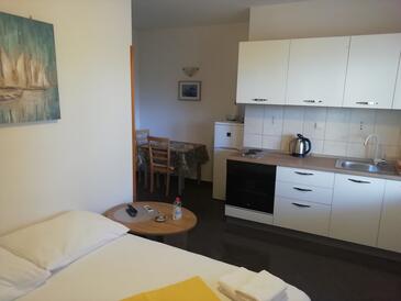 Ferienwohnung bietet Platz für 4 Gäste. Die Betten sind in Schlafzimmern, die es 1 gibt, und in Wohnzimmer, innerhalb einer Gesamtfläche von 29m2, angeordnet. Die Gäste haben eine eigene Terrasse zur Verfügung, auf der sie in warmen Sommernächten genießen können. Das Apartment bietet Meerblick. Es ist erlaubt, Speisen auf dem Gemeinschafts-Grill vorzubereiten.