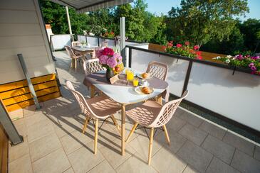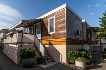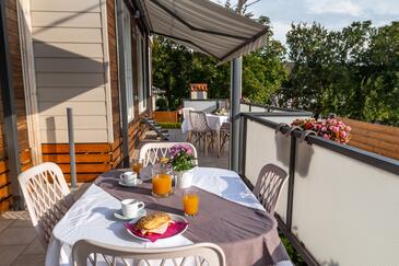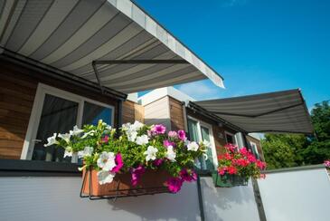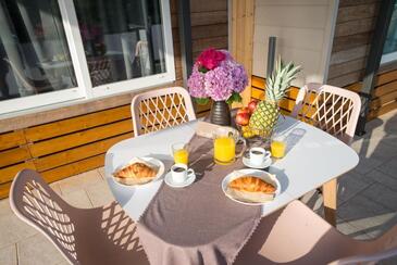 Ferienwohnung bietet Platz für 5 Gäste. Die Betten sind in Schlafzimmern, die es 2 gibt, und in Wohnzimmer, innerhalb einer Gesamtfläche von 34m2, angeordnet. Die Gäste haben eine eigene Terrasse zur Verfügung, auf der sie in warmen Sommernächten genießen können. Es ist erlaubt, Speisen auf dem Gemeinschafts-Grill vorzubereiten. Während ihres Aufenthalts können Gäste das gemeinsam zur Nutzung stehende Schwimmbad benutzen.