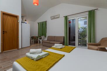 Studio bietet Platz für 3 Gäste. Die Betten sind in Schlafzimmern, die es 1 gibt, innerhalb einer Gesamtfläche von 21m2, angeordnet. Die Gäste haben einen eigenen Balkon zur Verfügung, auf der sie in warmen Sommernächten genießen können. Das Studio-Apartment bietet Meerblick. Es ist erlaubt, Speisen auf dem Gemeinschafts-Grill vorzubereiten.