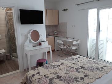 Ferienwohnung bietet Platz für 4 Gäste. Die Betten sind in Schlafzimmern, die es 1 gibt, und in Esszimmer, innerhalb einer Gesamtfläche von 28m2, angeordnet. Die Gäste haben eine eigene Terrasse zur Verfügung, auf der sie in warmen Sommernächten genießen können. Das Apartment bietet Meerblick. Es ist erlaubt, Speisen auf dem Gemeinschafts-Grill vorzubereiten.