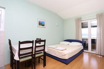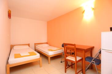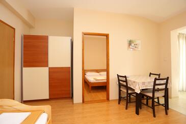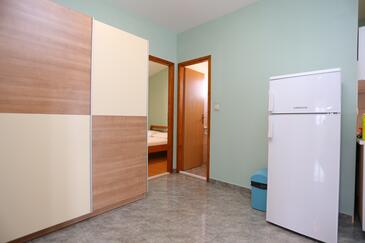 Ferienwohnung bietet Platz für 4 Gäste. Die Betten sind in Schlafzimmern, die es 1 gibt, und in Esszimmer, innerhalb einer Gesamtfläche von 31m2, angeordnet. Die Gäste haben eine eigene Terrasse zur Verfügung, auf der sie in warmen Sommernächten genießen können. Das Apartment bietet Meerblick. Es ist erlaubt, Speisen auf dem Gemeinschafts-Grill vorzubereiten.