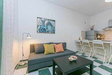 Ferienwohnung bietet Platz für 6 Gäste. Die Betten sind in Schlafzimmern, die es 2 gibt, und in Wohnzimmer, innerhalb einer Gesamtfläche von 49m2, angeordnet. Die Gäste haben eine eigene Terrasse zur Verfügung, auf der sie in warmen Sommernächten genießen können. Das Apartment bietet Meerblick. Es ist erlaubt, Speisen auf dem Gemeinschafts-Grill vorzubereiten. In der Unterkunftseinheit besteht die Möglichkeit des Mitbringens von Haustieren gegen Aufpreis.