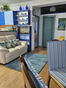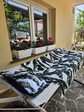 Ferienwohnung bietet Platz für 5 Gäste. Die Betten sind in Schlafzimmern, die es 2 gibt, und in Wohnzimmer, innerhalb einer Gesamtfläche von 65m2, angeordnet. Die Gäste haben eine eigene Terrasse zur Verfügung, auf der sie in warmen Sommernächten genießen können. Es ist erlaubt, Speisen auf dem Gemeinschafts-Grill vorzubereiten. In der gebuchten Unterkunftseinheit zahlt man am Ort ein Depositum ( der Preis ist an der Internetseite angeführt ).