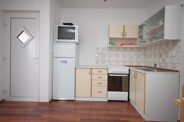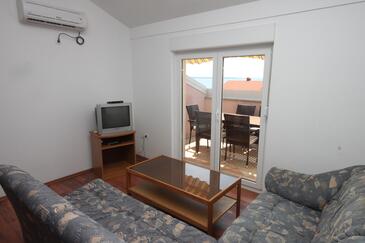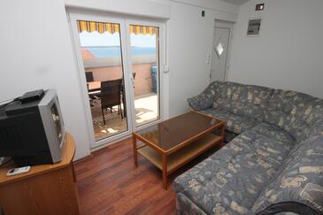 Ferienwohnung bietet Platz für 6 Gäste. Die Betten sind in Schlafzimmern, die es 2 gibt, und in Wohnzimmer, innerhalb einer Gesamtfläche von 50m2, angeordnet. Die Gäste haben eine eigene Terrasse zur Verfügung, auf der sie in warmen Sommernächten genießen können. Das Apartment bietet Meerblick. Es ist erlaubt, Speisen auf dem Gemeinschafts-Grill vorzubereiten.