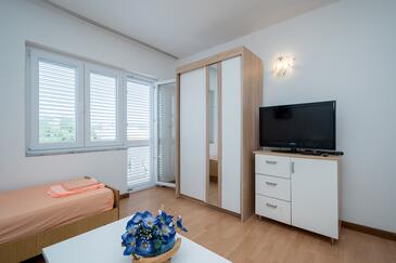 Studio bietet Platz für 4 Gäste. Die Betten sind in Schlafzimmern, die es 2 gibt, innerhalb einer Gesamtfläche von 42m2, angeordnet. Die Gäste haben eine eigene Terrasse zur Verfügung, auf der sie in warmen Sommernächten genießen können. Es ist erlaubt, Speisen auf dem Gemeinschafts-Grill vorzubereiten.
