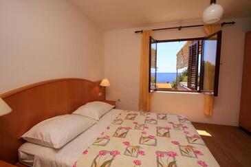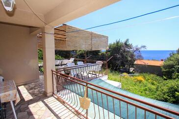 Ferienwohnung bietet Platz für 8 Gäste. Die Betten sind in Schlafzimmern, die es 4 gibt, innerhalb einer Gesamtfläche von 100m2, angeordnet. Die Gäste haben eine eigene Terrasse zur Verfügung, auf der sie in warmen Sommernächten genießen können. Das Apartment bietet Meerblick. Es ist erlaubt, Speisen auf dem Gemeinschafts-Grill vorzubereiten.