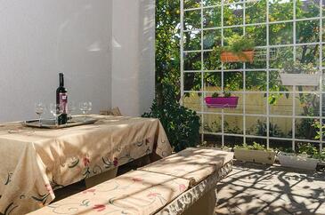 Ferienwohnung bietet Platz für 6 Gäste. Die Betten sind in Schlafzimmern, die es 2 gibt, und in Wohnzimmer, innerhalb einer Gesamtfläche von 70m2, angeordnet. Die Gäste haben eine eigene Terrasse zur Verfügung, auf der sie in warmen Sommernächten genießen können. Für vollen Genuss und Entspannung gibt es einen privaten Grill für Gäste dieser Unterkunft. In der Unterkunftseinheit besteht die Möglichkeit des Mitbringens von Haustieren gegen Aufpreis.