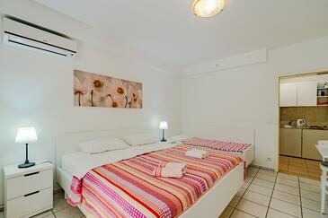 Ferienwohnung bietet Platz für 4 Gäste. Die Betten sind in Schlafzimmern, die es 2 gibt, innerhalb einer Gesamtfläche von 47m2, angeordnet. Die Gäste haben eine eigene Terrasse zur Verfügung, auf der sie in warmen Sommernächten genießen können. Das Apartment bietet Meerblick. Es ist erlaubt, Speisen auf dem Gemeinschafts-Grill vorzubereiten.