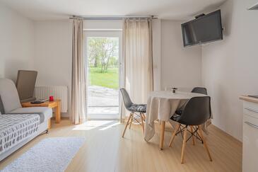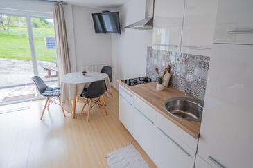 Ferienwohnung bietet Platz für 4 Gäste. Die Betten sind in Schlafzimmern, die es 2 gibt, innerhalb einer Gesamtfläche von 60m2, angeordnet. Die Gäste haben einen eigenen Balkon zur Verfügung, auf der sie in warmen Sommernächten genießen können. Es ist erlaubt, Speisen auf dem Gemeinschafts-Grill vorzubereiten.