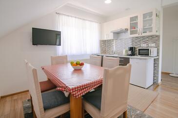 Ferienwohnung bietet Platz für 5 Gäste. Die Betten sind in Schlafzimmern, die es 2 gibt, und in Wohnzimmer, innerhalb einer Gesamtfläche von 57m2, angeordnet. Die Gäste haben eine eigene Terrasse zur Verfügung, auf der sie in warmen Sommernächten genießen können.