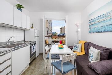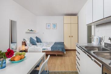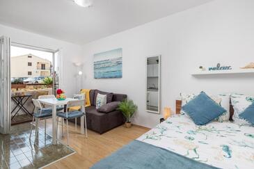 Studio bietet Platz für 2 Gäste. Die Betten sind in Wohnzimmer, innerhalb einer Gesamtfläche von 26m2, angeordnet. Die Gäste haben einen eigenen Balkon zur Verfügung, auf der sie in warmen Sommernächten genießen können.