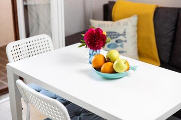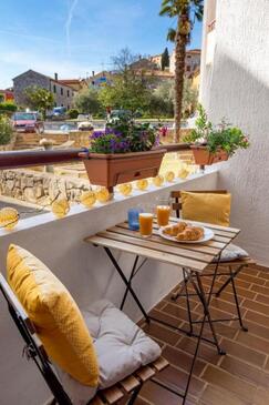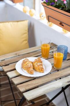 Studio bietet Platz für 2 Gäste. Die Betten sind in Wohnzimmer, innerhalb einer Gesamtfläche von 26m2, angeordnet. Die Gäste haben einen eigenen Balkon zur Verfügung, auf der sie in warmen Sommernächten genießen können.