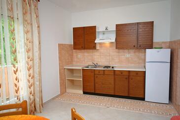 Ferienwohnung bietet Platz für 5 Gäste. Die Betten sind in Schlafzimmern, die es 2 gibt, innerhalb einer Gesamtfläche von 71m2, angeordnet. Die Gäste haben eine eigene Terrasse zur Verfügung, auf der sie in warmen Sommernächten genießen können. Es ist erlaubt, Speisen auf dem Gemeinschafts-Grill vorzubereiten.