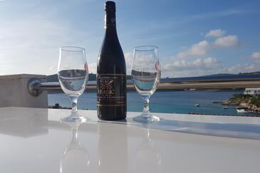 Ferienwohnung bietet Platz für 5 Gäste. Die Betten sind in Schlafzimmern, die es 2 gibt, und in Wohnzimmer, innerhalb einer Gesamtfläche von 48m2, angeordnet. Die Gäste haben eine eigene Terrasse zur Verfügung, auf der sie in warmen Sommernächten genießen können. Das Apartment bietet Meerblick. Es ist erlaubt, Speisen auf dem Gemeinschafts-Grill vorzubereiten.