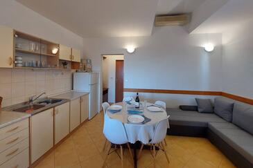 Ferienwohnung bietet Platz für 5 Gäste. Die Betten sind in Schlafzimmern, die es 2 gibt, und in Wohnzimmer, innerhalb einer Gesamtfläche von 36m2, angeordnet. Die Gäste haben eine eigene Terrasse zur Verfügung, auf der sie in warmen Sommernächten genießen können. Das Apartment bietet Meerblick. Es ist erlaubt, Speisen auf dem Gemeinschafts-Grill vorzubereiten.