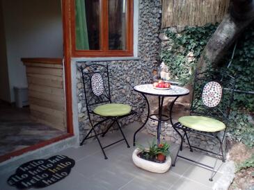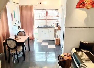 Studio bietet Platz für 2 Gäste. Die Betten sind in Wohnzimmer, innerhalb einer Gesamtfläche von 35m2, angeordnet. Die Gäste haben einen eigenen Balkon zur Verfügung, auf der sie in warmen Sommernächten genießen können. Das Studio-Apartment bietet Meerblick. Es ist erlaubt, Speisen auf dem Gemeinschafts-Grill vorzubereiten.