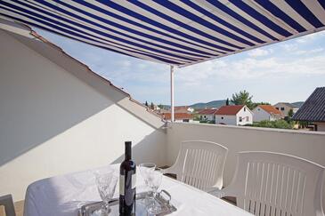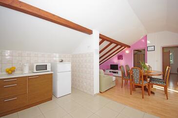 Ferienwohnung bietet Platz für 7 Gäste. Die Betten sind in Schlafzimmern, die es 3 gibt, innerhalb einer Gesamtfläche von 99m2, angeordnet. Die Gäste haben eine eigene Terrasse zur Verfügung, auf der sie in warmen Sommernächten genießen können. Es ist erlaubt, Speisen auf dem Gemeinschafts-Grill vorzubereiten.