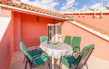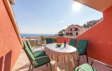 Ferienwohnung bietet Platz für 6 Gäste. Die Betten sind in Schlafzimmern, die es 2 gibt, und in Wohnzimmer, innerhalb einer Gesamtfläche von 64m2, angeordnet. Die Gäste haben eine eigene Terrasse zur Verfügung, auf der sie in warmen Sommernächten genießen können. Das Apartment bietet Meerblick. Es ist erlaubt, Speisen auf dem Gemeinschafts-Grill vorzubereiten.